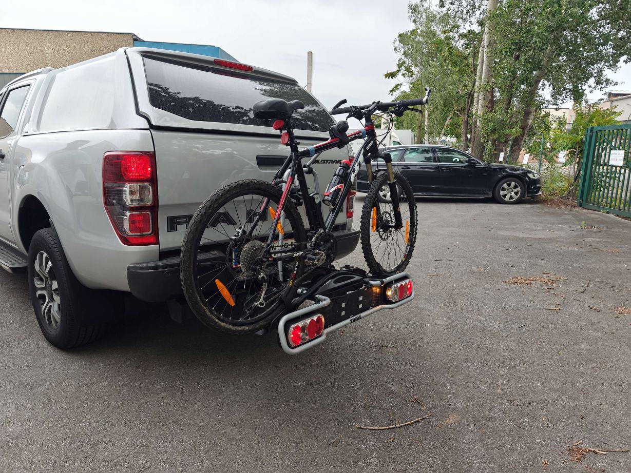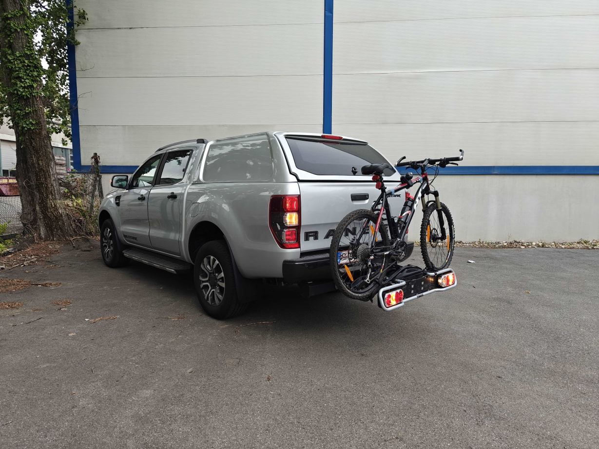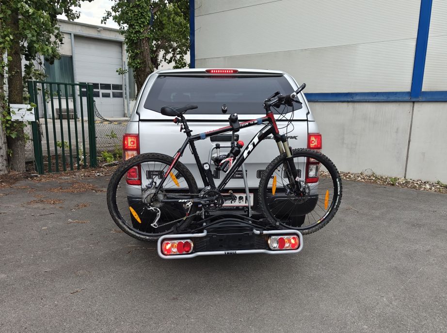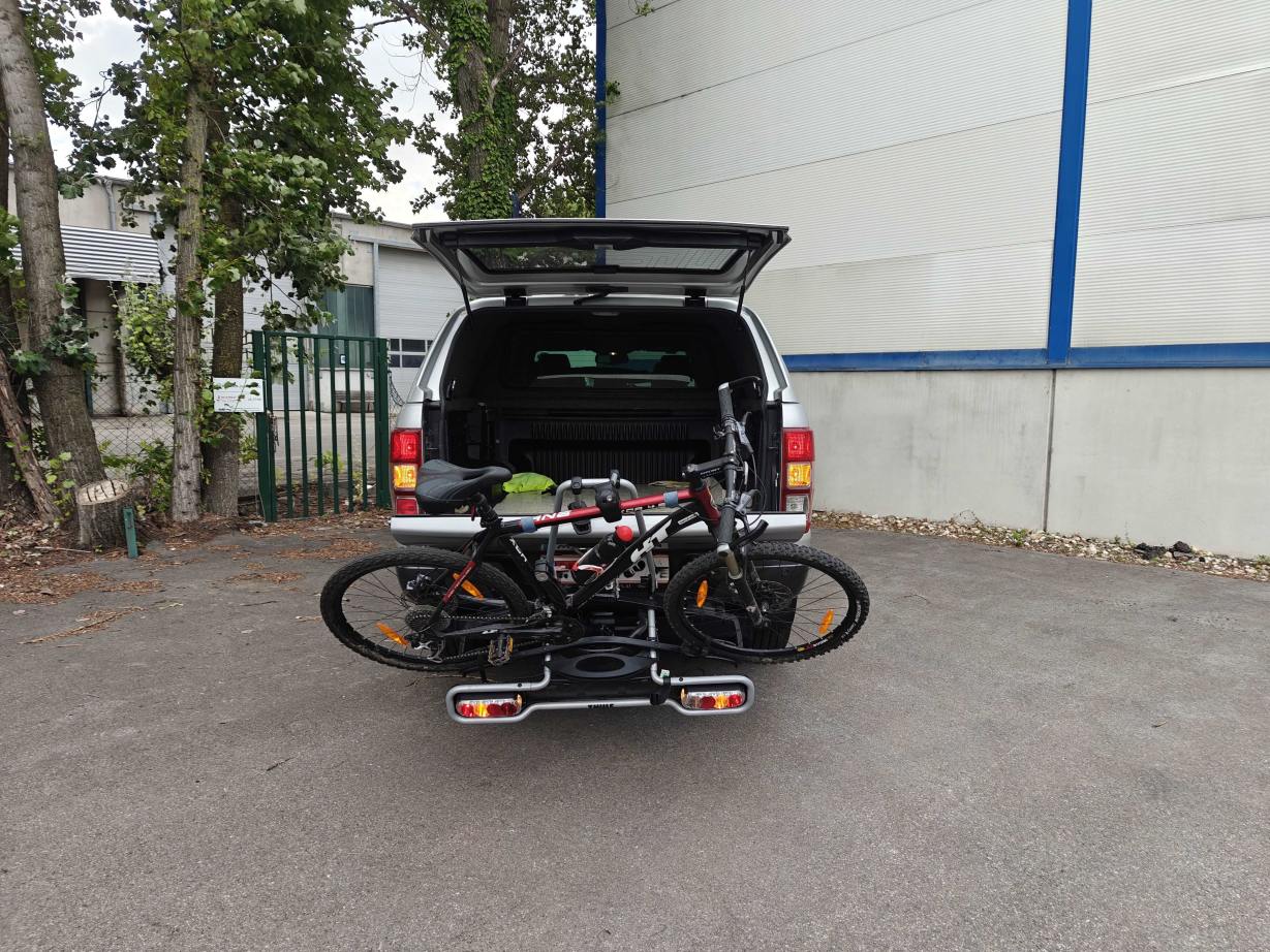 Der Fahrradträger ist versperrbar und lässt sich mit zwei Handgriffen wegklappen, sodass Sie den Kofferraum Ihres Autos erreichen können. Es können maximal zwei Fahrräder transportiert werden (Fahrrad von den Fotos nicht inkludiert). Sie/Wir können einfach Ihr Auto-Kennzeichen auf den Träger ummontieren. In Österreich ist die rote Kennzeichen-Tafel nicht verpflichtend.