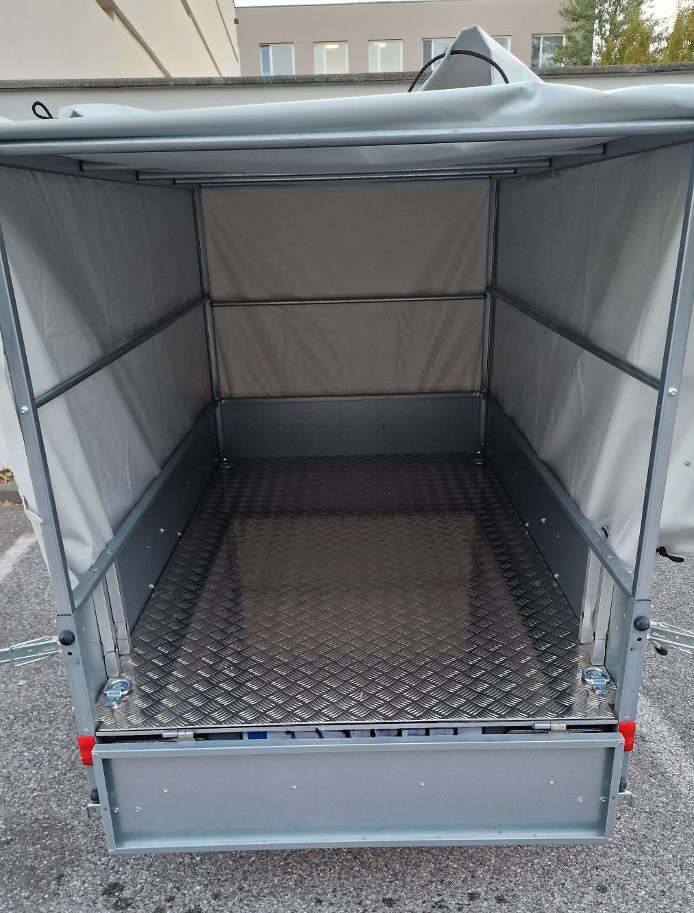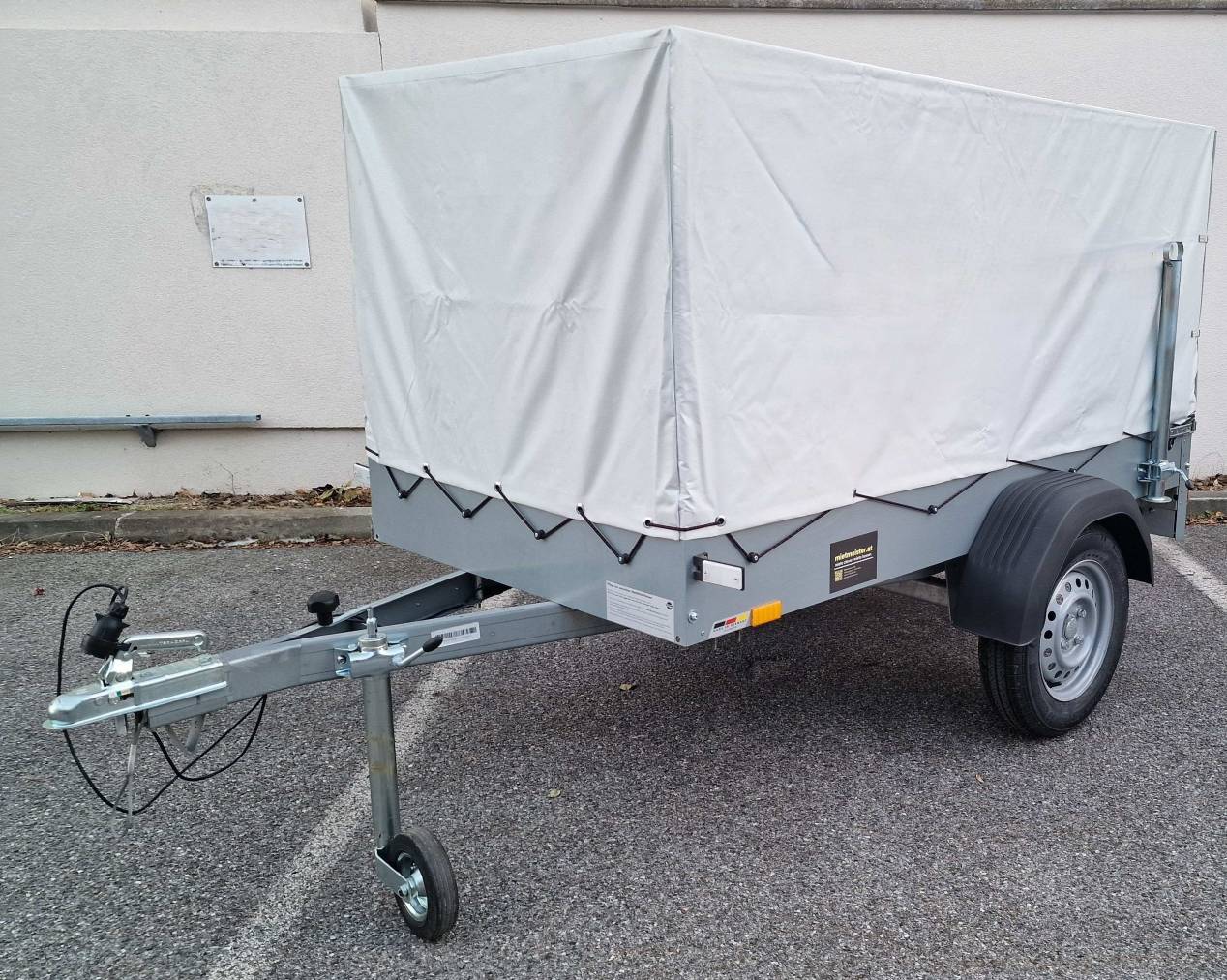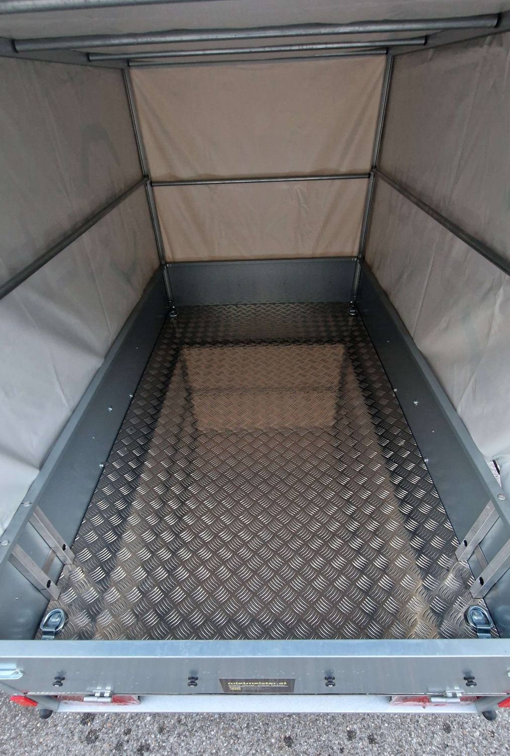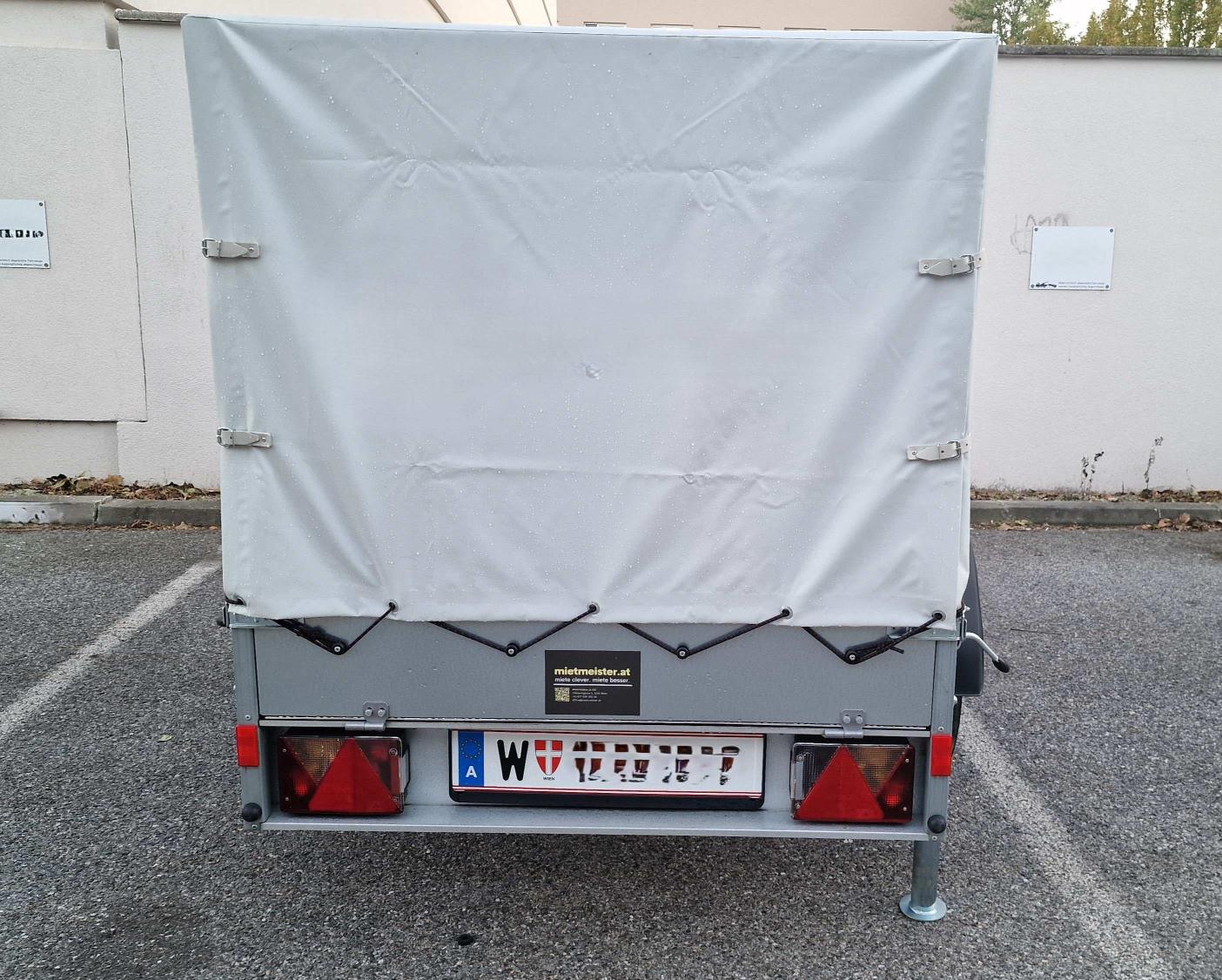 Anhäger mit einer Grundfläche von 205 x 110cm und einer Höhe von 102cm bis zur Planenabdeckung zu vermieten. Der Anhänger ist mit einem Alu-Riffelblech Boden und vier Stück 800 daN Zurrösen versehen. Am Heck befinden sich zwei Stützfüße welche das beladen in schmalen Gärten im ungekoppelten Zustand möglich machen.