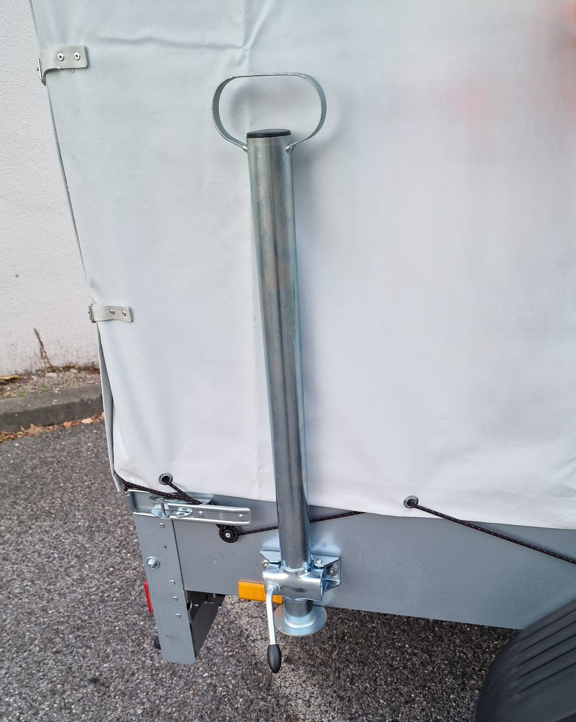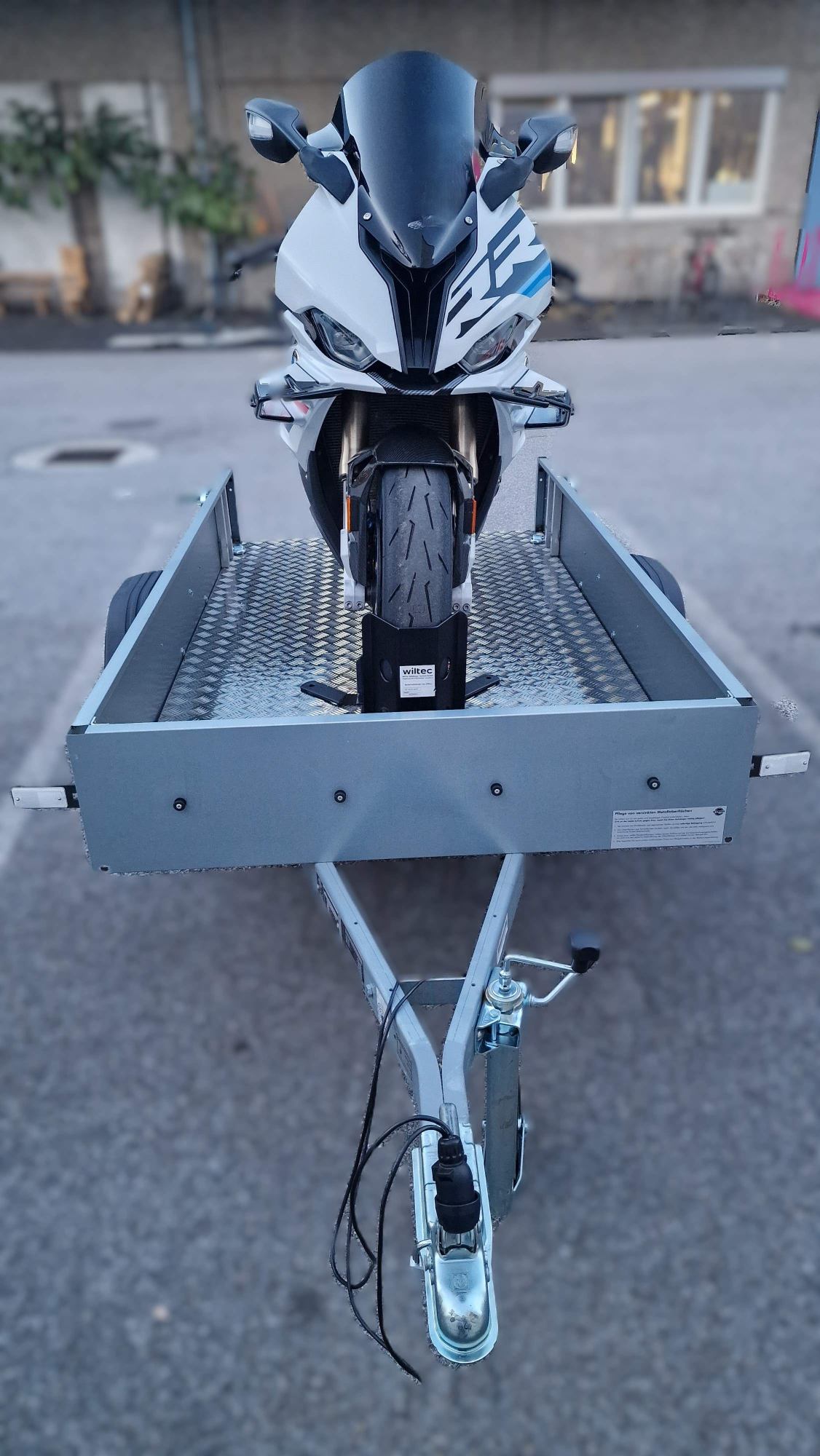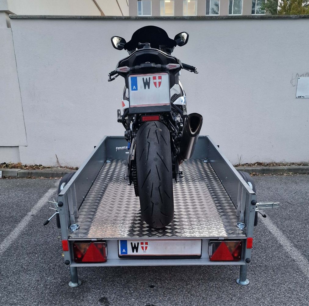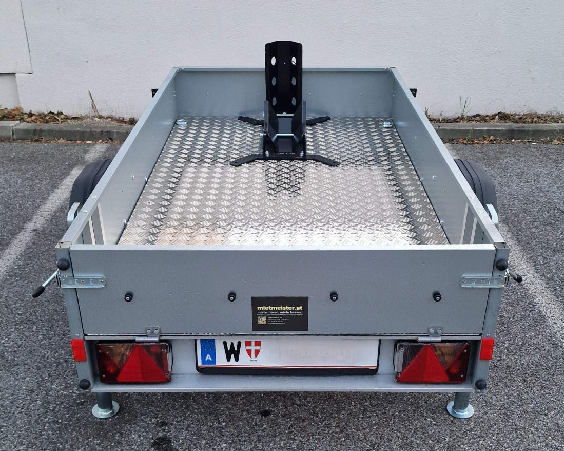 Die Plane kann für den Transport von Paletten oder anderen sperrigen Gegenständen mit wenigen Handgriffen entfernt werden. Für den Transport eines Motorrads können wir den Anhänger für Sie mit der, auf den Fotos dargestellten Transportwippe ausrüsten.